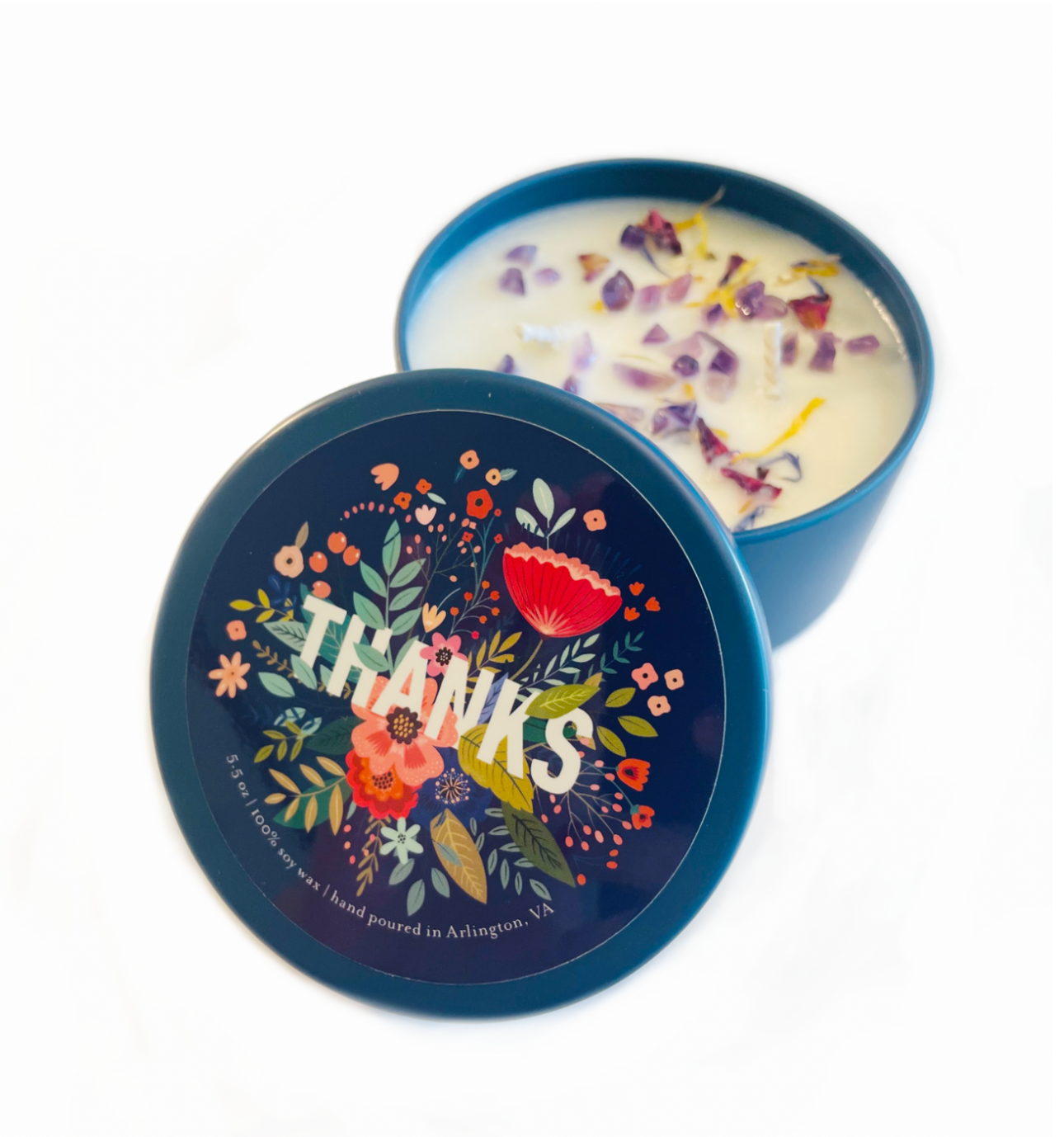 Our Thanks candle is clean and bright scent. Infused with mixed dry flower petals and amethyst crystal chips, it's a perfect thank you gift for any occasion! It brighten small spaces and add a floral touch wherever you need it.